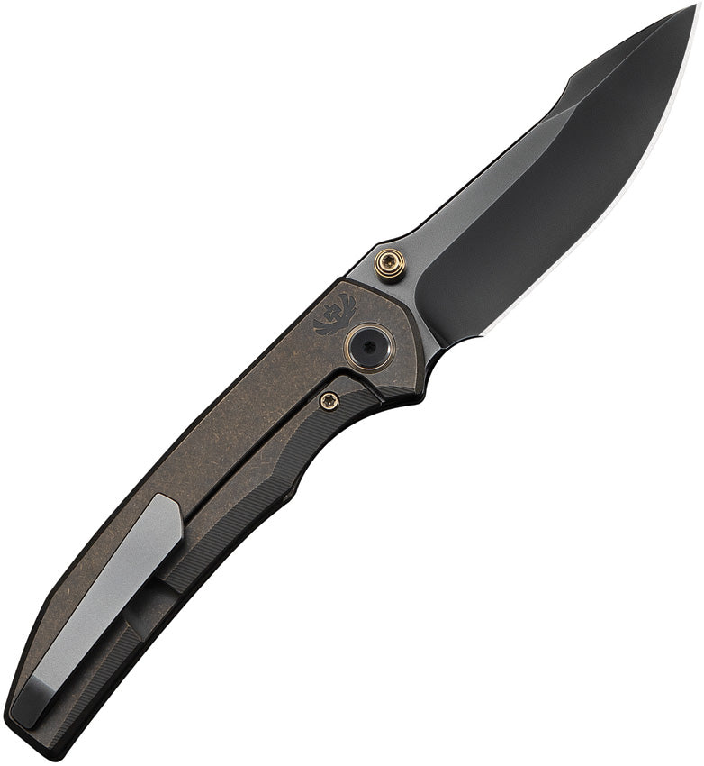 4.32'' (10.97cm) closed. 3.33'' (8.46cm) polished gray finish Bohler M390 steel harpoon style blade. Hollow Grind. Bronze 6AL4V titanium handle. Framelock. Dual sided thumb stud(s). Tip-Up right carry pocket clip. Designed by Sam Tran. Black nylon zippered storage case. Boxed.