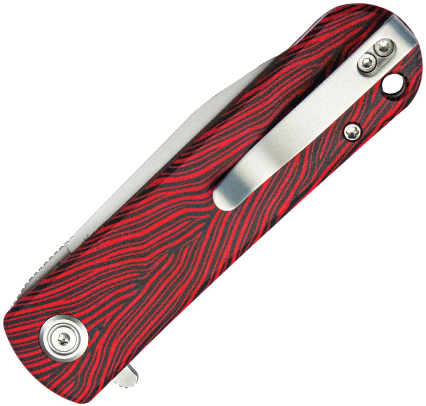 4.14'' closed. 2.99'' Stonewashed finish AUS-10 steel clip point blade. Flat Grind. Red and black G-Mascus G10 handle. Linerlock. Caged Ceramic Ball Bearings. Flipper Tab. Lanyard Hole. Tip-Up reversible pocket clip. Designed by Keanu Alfaro. Boxed.