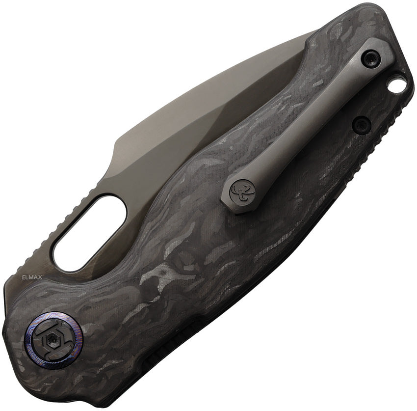 4.72'' closed. 3.62'' Black DLC coated finish Elmax steel drop point blade. Black marbled carbon fiber handle. Verta Lock. Thumb slot. Lanyard hole. Tip-Up reversible pocket clip. Boxed.