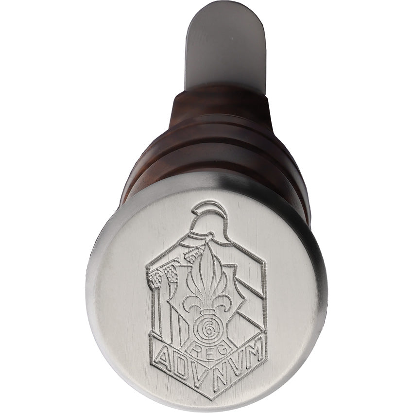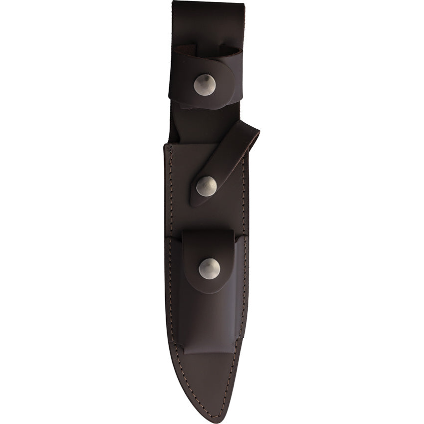 12.25" (31.12cm) overall. 7" (17.78cm) matte finish 440 stainless blade. Brown knurled wood handle. Stainless guard and pommel. Blade etched 6th Regiment Etranger D' Infanterie. Heavy brown leather belt sheath with stone pocket and sharpening stone. Made in Italy.