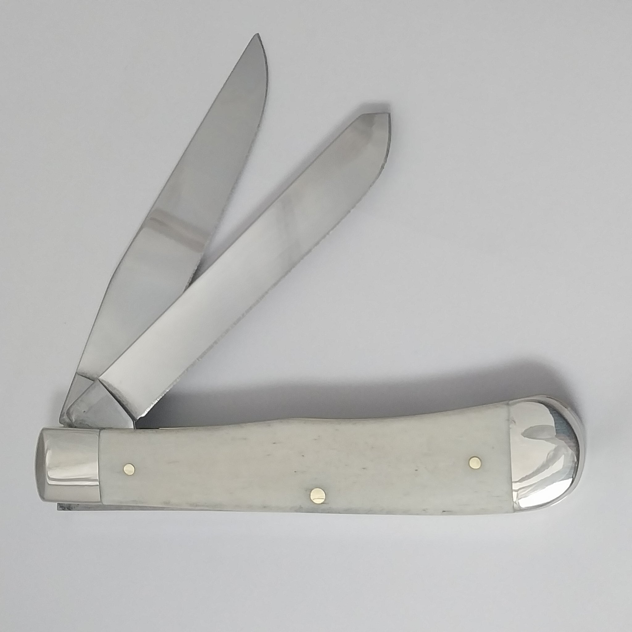 6254 SS pattern. 4.13'' closed. 3.25'' and 3.27'' Mirror polished finish stainless steel clip and spey blade(s). Smooth natural bone handle. Slip Joint. Nickel silver bolsters. Nail Nicks. Inlay shield. Boxed.