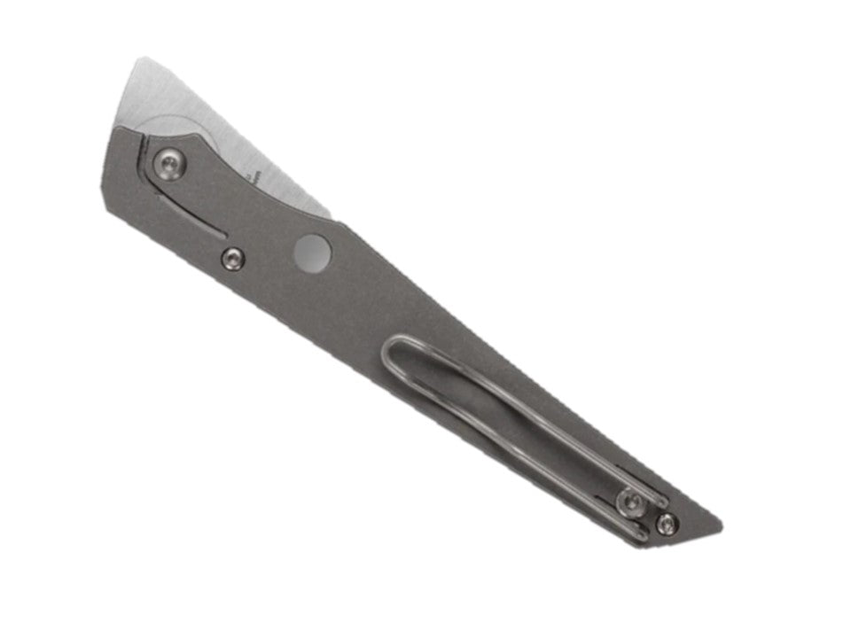 4.77'' closed. 3.63'' Satin finish Bohler M390 steel tanto blade. Saber Grind. Gray titanium handle. Slip Joint. Thumb slot. Tip-Up reversible wire pocket clip. Designed by Paul Alexander. Boxed. Made in Italy. 2.2 oz.