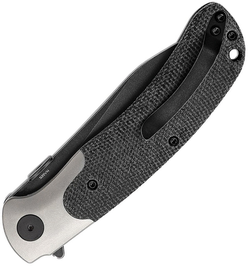 4.8'' closed. 3.66'' Black titanium coated stonewashed finish CPM-S35VN steel blade. Black micarta handle. Gray titanium bolster(s). Linerlock. Ceramic ball bearing. Tip-Up right carry pocket clip. Flipper tab. Lanyard Hole. Thumb disk. Designed by Steve Cheng. Boxed.