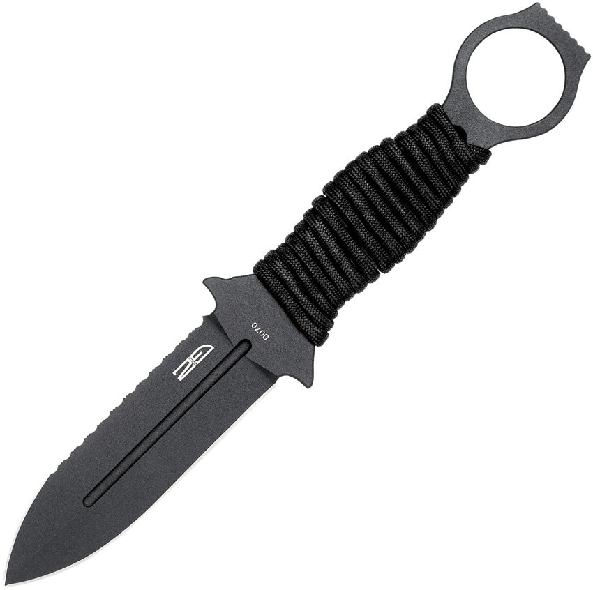 8.88" (22.56cm) overall. 4" (10.16cm) black powder coated serrated 14C28N Sandvik stainless dagger blade. Skeletonized handle. Full tang. Finger ring. Double edge blade. Includes 550 paracord for optional handle wrap. Black Kydex MOLLE compatible belt sheath. Boxed.