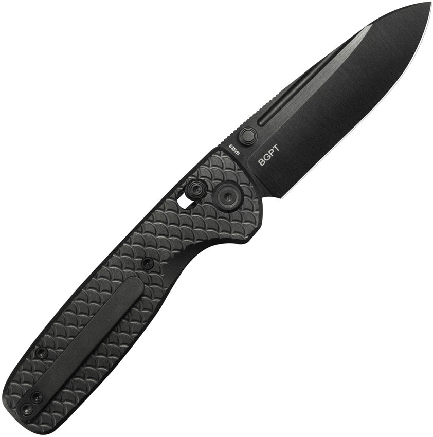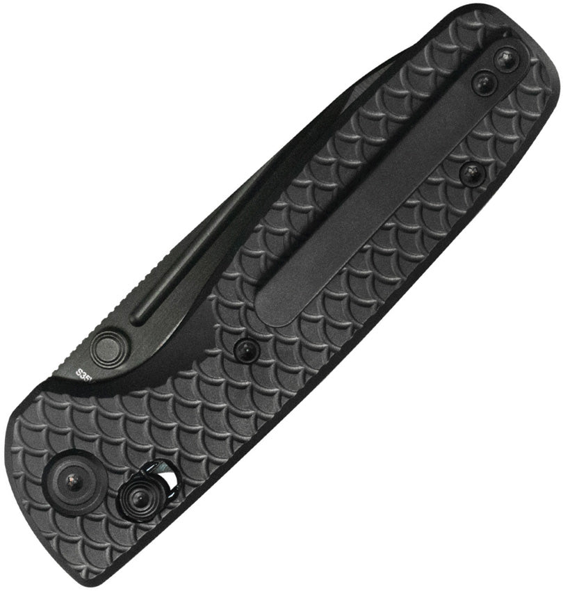 4.17'' closed. 3.19'' Black belt satin DLC coated finish CPM-S35VN steel drop point blade. Flat Grind. Black 6AL4V titanium handle. Axis Lock. Dual sided thumb studs. Tip-Up right carry pocket clip. Caged Ceramic Ball Bearing. Designed by Garet Caronna. Boxed.