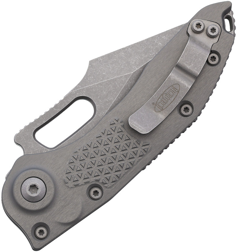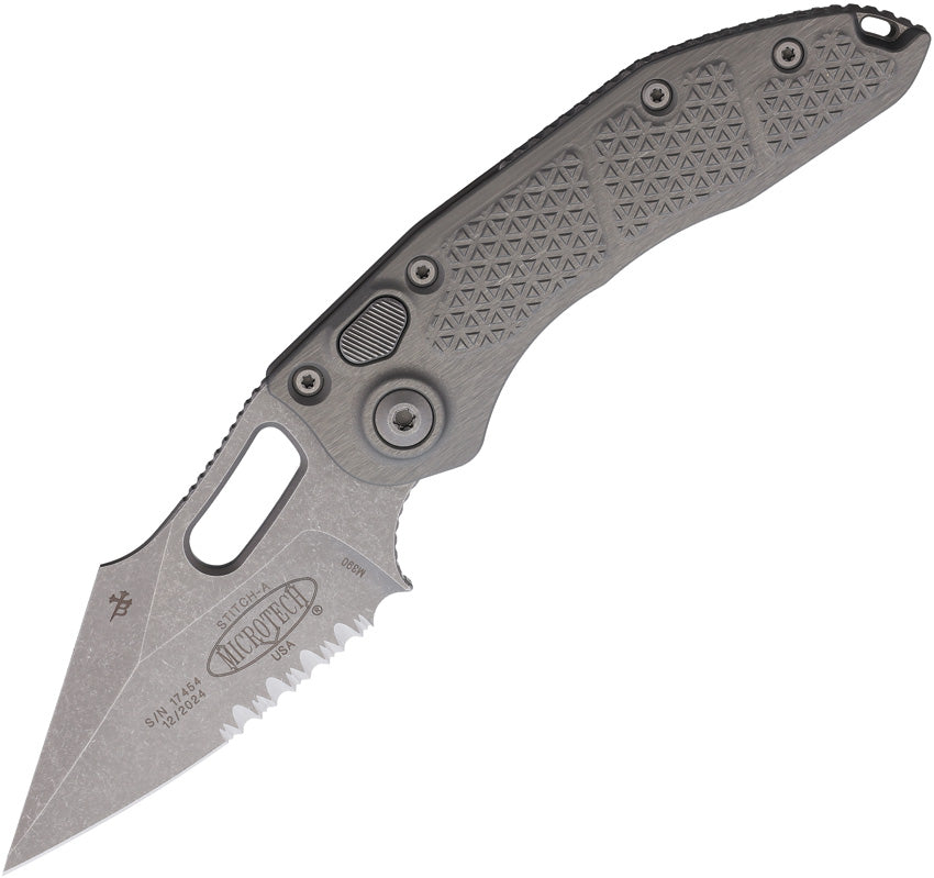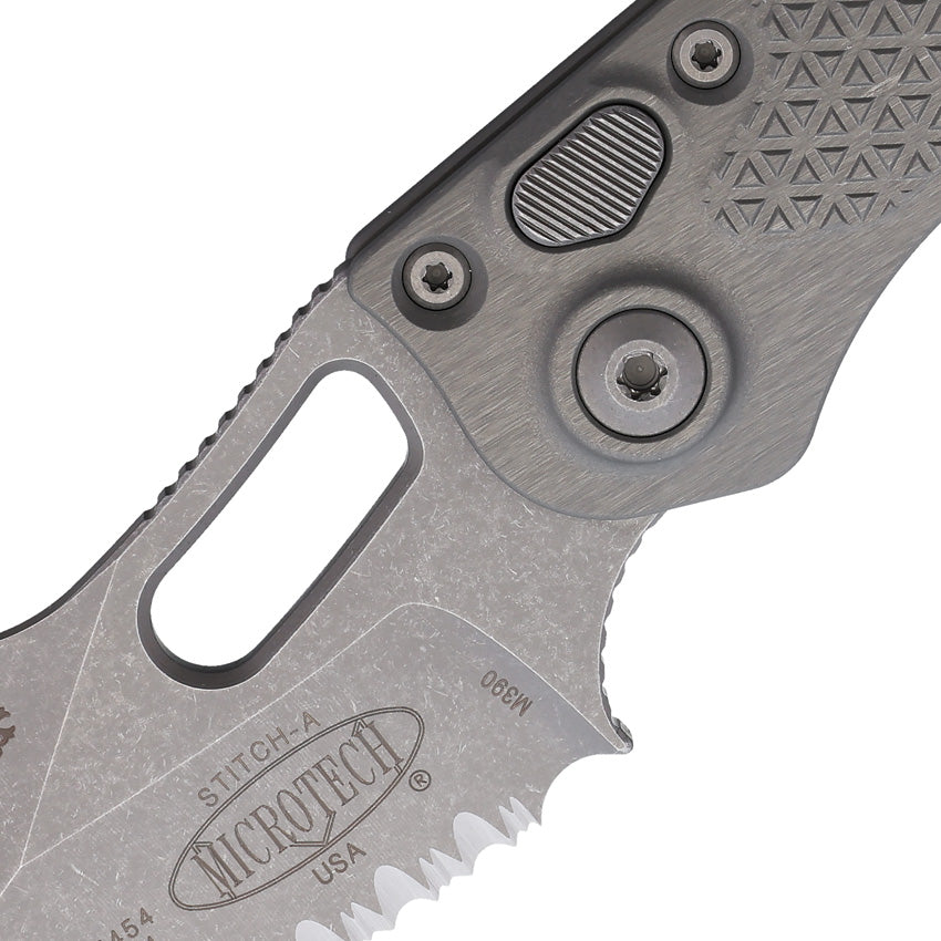 Microtech Automatic Stitch Knife Button Lock Natural Clear Gray Aluminum Apocalyptic Serrated Blade 16911APNC