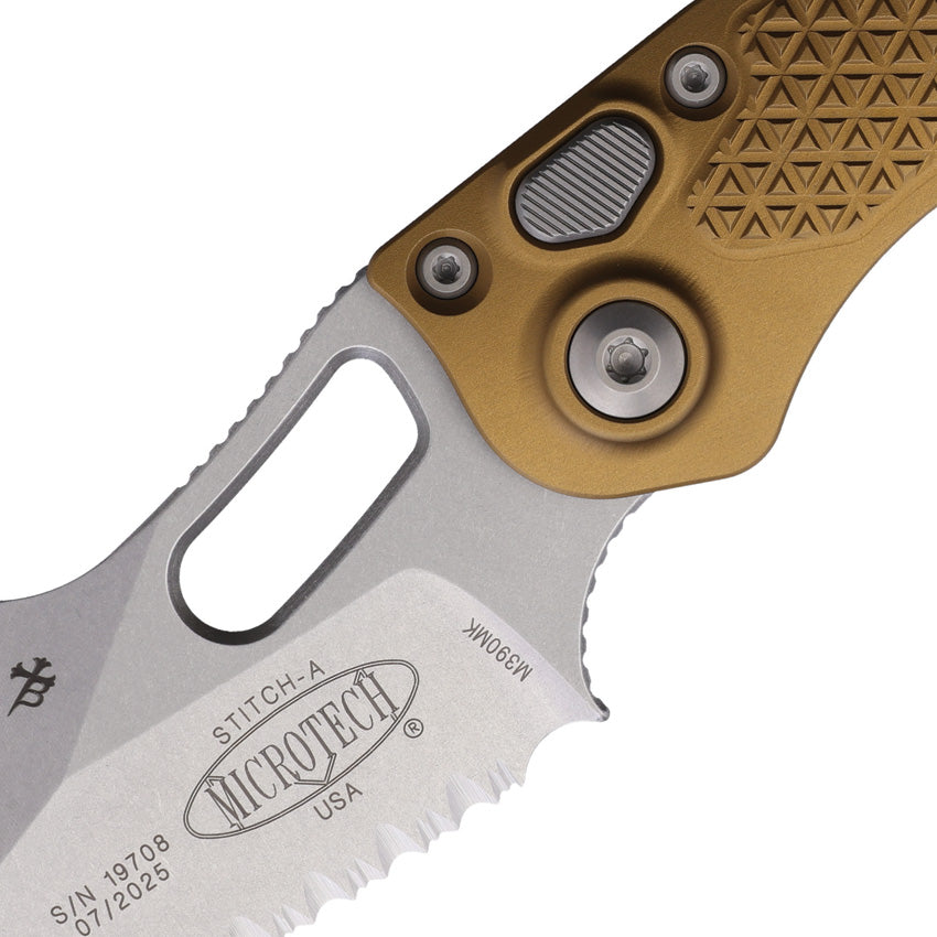 Microtech Automatic Stitch Knife Button Lock Tan Aluminum Serrated Blade 16912TA
