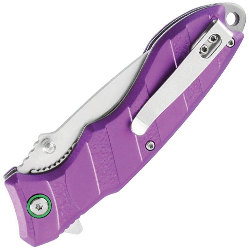 Assisted opening. 4.75" (12.07cm) closed. 3.25" (8.26cm) satin finish partially serrated 3Cr13MoV stainless blade. Purple aluminum handle. Extended tang. Thumb stud. Lanyard hole. Pocket clip. Green accents. Boxed.