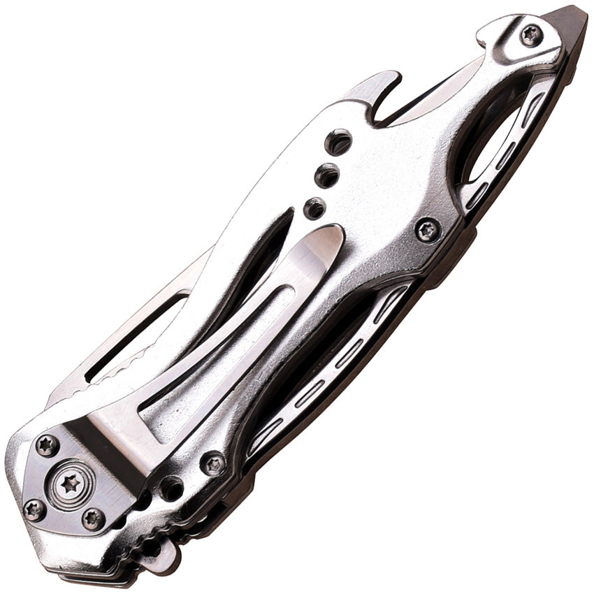 Assisted opening. 4.75" (12.07cm) closed. 3.25" (8.26cm) satin finish stainless blade. Silver aluminum handle. Thumb pull. Bottle opener. Lanyard hole. Pocket clip. Boxed.