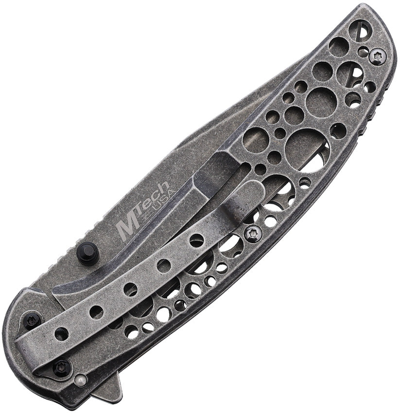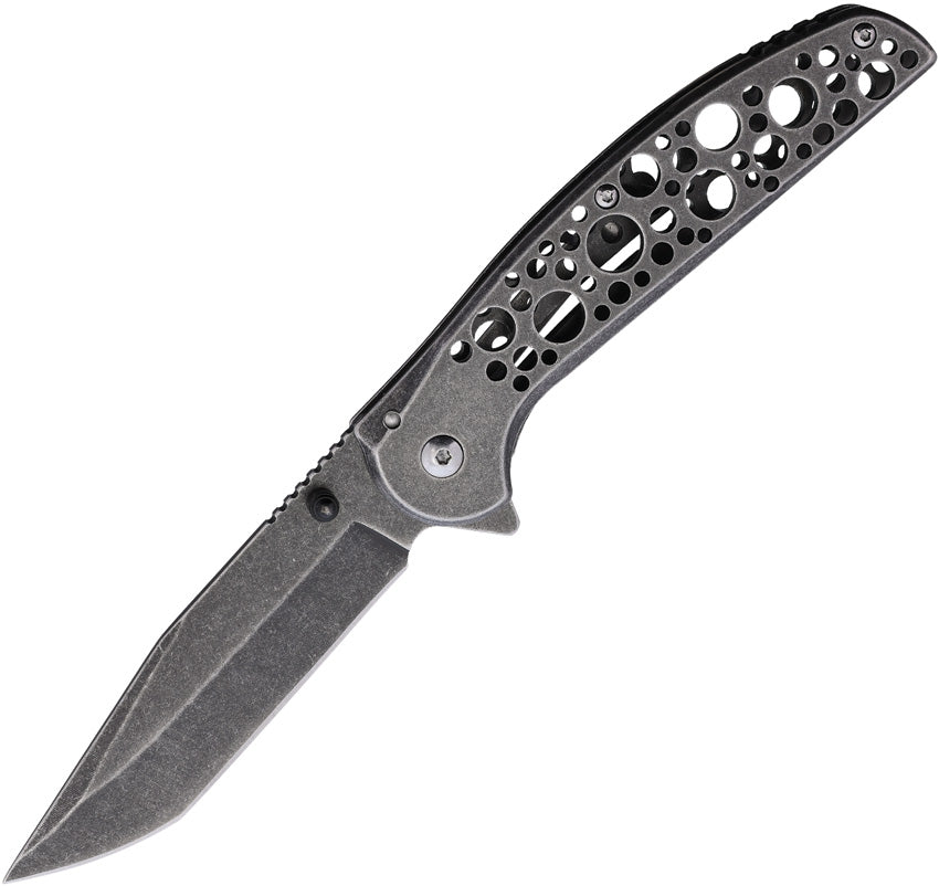 4.5" (11.43cm) closed. 3.5" (8.89cm) stonewash finish stainless tanto blade. Black stonewash finish stainless handle. Extended tang. Thumb stud. Lanyard hole. Pocket clip. Boxed.