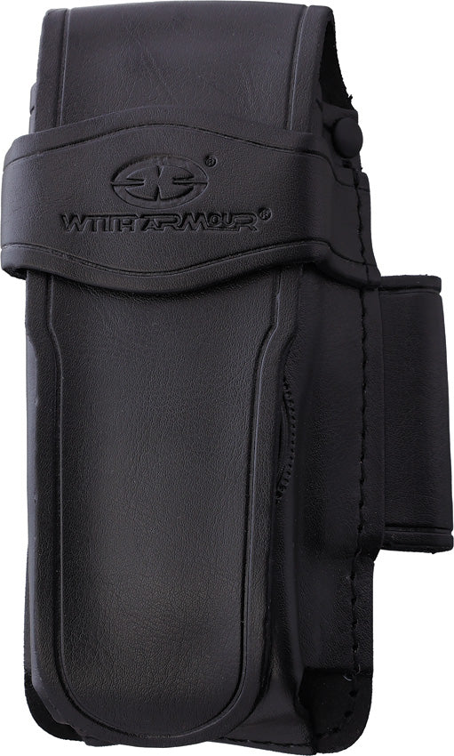 5.5" (13.97cm) closed. 4.25" (10.8cm) black titanium coated partially serrated 12C27 Sandvik stainless blade. Black micarta handle. Lanyard hole. Thumb stud. Pocket clip. Red G10 liners. Pin-Lock. Black leather belt sheath. Boxed.