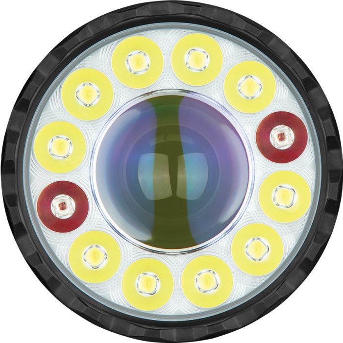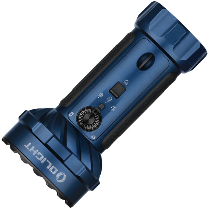 Dimensions: 5.25" x 2.6" x 1.69". Water resistant. Impact resistant. Rechargeable. Lanyard. Five lighting configurations: Floodlight, Spotlight, Spot/flood light, Red light, Side light. Modes: Flood-L4-2 (10,000-2500 lumens, 2+90m runtime); L4-1 (5000-2500-550 lumens, 4+90+80m runtime); L3-2 (2500-1200-600 lumens, 30+60+80m runtime); L3-1 (1200-600-150 lumens, 3+1+3h runtime); L2-2 (600-150 lumens, 13+3h runtime); L1-2 (150 lumens, 27h runtime); L1-1 (1.5 lumens, 50 day runtime). Spotlight-L4-2 (1350-600-400 lumens, 4+170+50m runtime); L4-1 (1000-600-400-135 lumens, 8+170+60+170m runtime); L3-2 (800-600-400-100 lumens, 15+220+50+200m runtime); L3-1 (600-400-100 lumens, 3+1+3h runtime); L2-2 (400-100 lumens, 6+4h runtime); L1-2 (100 lumens, 30h runtme); L1-1 (50 lumens, 62h runtime); Moonlight (0.5 lumens, 95 day runtime). Flood/Spot L4-2 (8000-1800 lumens, 2+120m runtime); L4-1 (6000-1800-1000 lumens, 4+120+60m runtime); L3-2 (3500-1000-700 lumens, 6+130+50m runtime); L3-1 (1800-700-100 lumens, 1.5+1.5+1h runtime); L2-2 (1000-300 lumens, 3+2.5h runtime); L2-1 (7000-300 lumens, 5.5+2.5h runtime); L1-2 (300 lumens, 14h runtime); L1-1 (100 lumens, 37h runtime); Moonlight (2 lumens, 40 day runtime); Red L4 (400-120-40 lumens, 2+5+10h runtime); L3 (100-30 lumens, 15+10h runtime); L2 (25 lumens, 84h runtime); L1 (5 lumens, 8.5 day runtime); Moonlight (1 lumen, 35 day runtime); Side L4 (200-100-30 lumens, 3+3+11h runtime); L3 (100-30 lumens, 10h runtime); L2 (25-5 lumens, 65+20h runtime); L1 (5 lumens, 10 day runtime); Moonlight (0.5 lumens, 150 day runtime). Strike bezel. MCC3 magnetic charging port. Silicone boday surface. Side light emitter. USB-C port. Toggle switch. Rotary knob and selector. Hidden lanyard hole. Requires (1) Lithium battery (included). Aluminum construction. Color: Midnight Blue. Boxed.