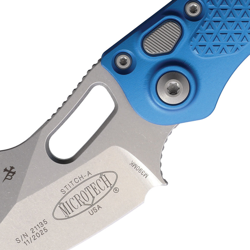 Microtech Automatic Stitch Knife Button Lock Blue Aluminum Stonewash Wharncliffe Blade 16910BL