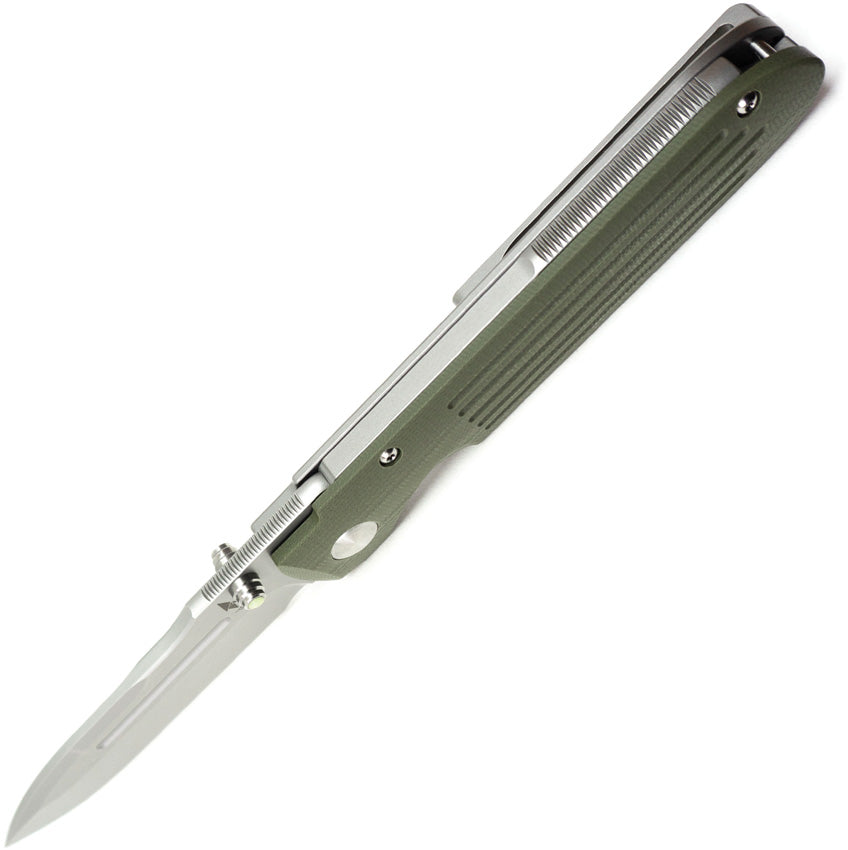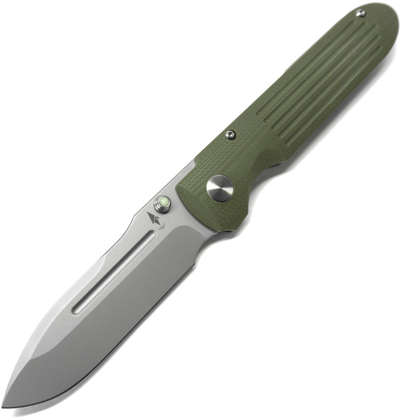 4.63" (11.76cm) closed. 3.5" (8.89cm) satin finish Terravantium Dendritic Cobalt steel blade. OD green G10 handle with gray titanium back handle. Thumb stud. Pocket clip. Lanyard pin fits Type 1 cordage. GITD thumb stud cabochons. Black nylon zippered storage case. Boxed.