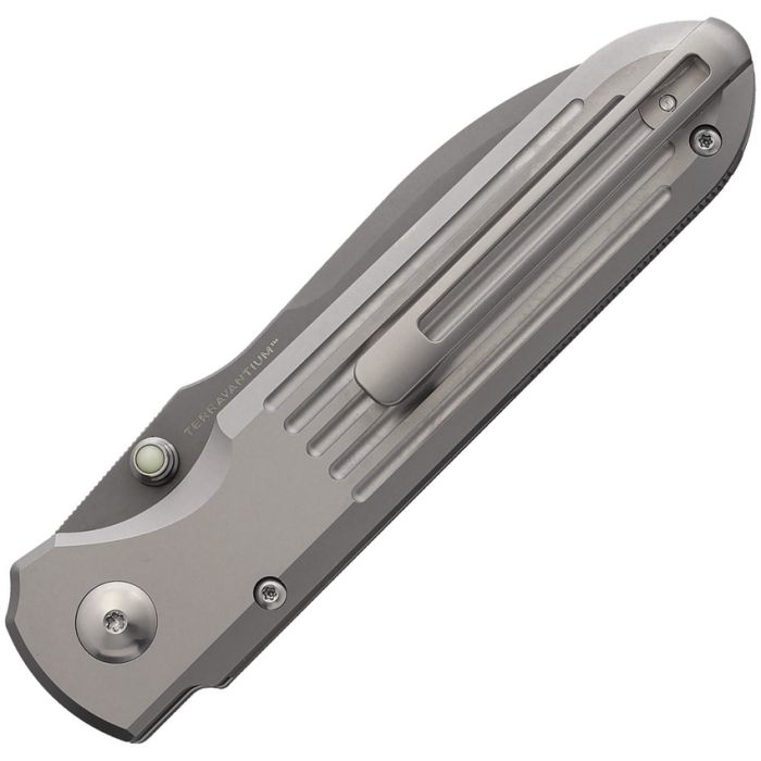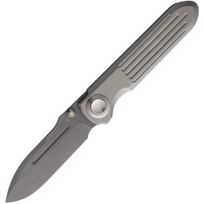4.63" (11.76cm) closed. 3.5" (8.89cm) bead blasted finish Terravantium Dendritic Cobalt steel blade. Gray 6AL4V titanium handle. Pivot Button Lock. Dual sided thumb studs. Pocket clip. Ceramic bearings. Lanyard pin fits Type 1 cordage. GITD thumb stud cabochons. Black nylon zippered storage case. Boxed.