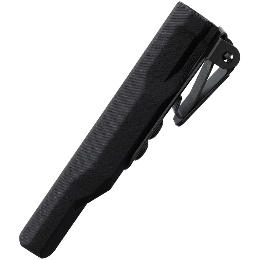 5.5" (13.97cm) overall. 3.38" (8.59cm) satin finish blade. Black aluminum handle. Lanyard hole. DC53 steel blade. Black 3-D printed sheath with UltiClip. Zippered storage case.