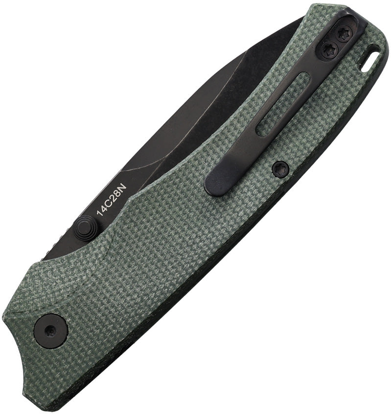 4.63" (11.76cm) closed. 3.13" (7.95cm) black titanium coated 14C28N Sandvik steel drop point blade. Military green canvas micarta handle. Button Lock. Dual sided thumb stud(s). Lanyard hole. Pocket clip. Black nylon zippered storage case. Boxed.