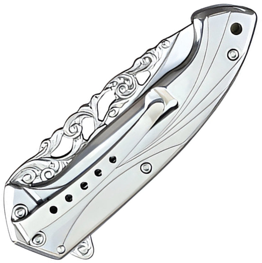 Assisted opening. 4.63" (11.76cm) closed. 3.25" (8.26cm) satin finish stainless blade. Sculpted stainless handle with Wolf synthetic onlay. Extended tang. Pocket clip. Boxed.