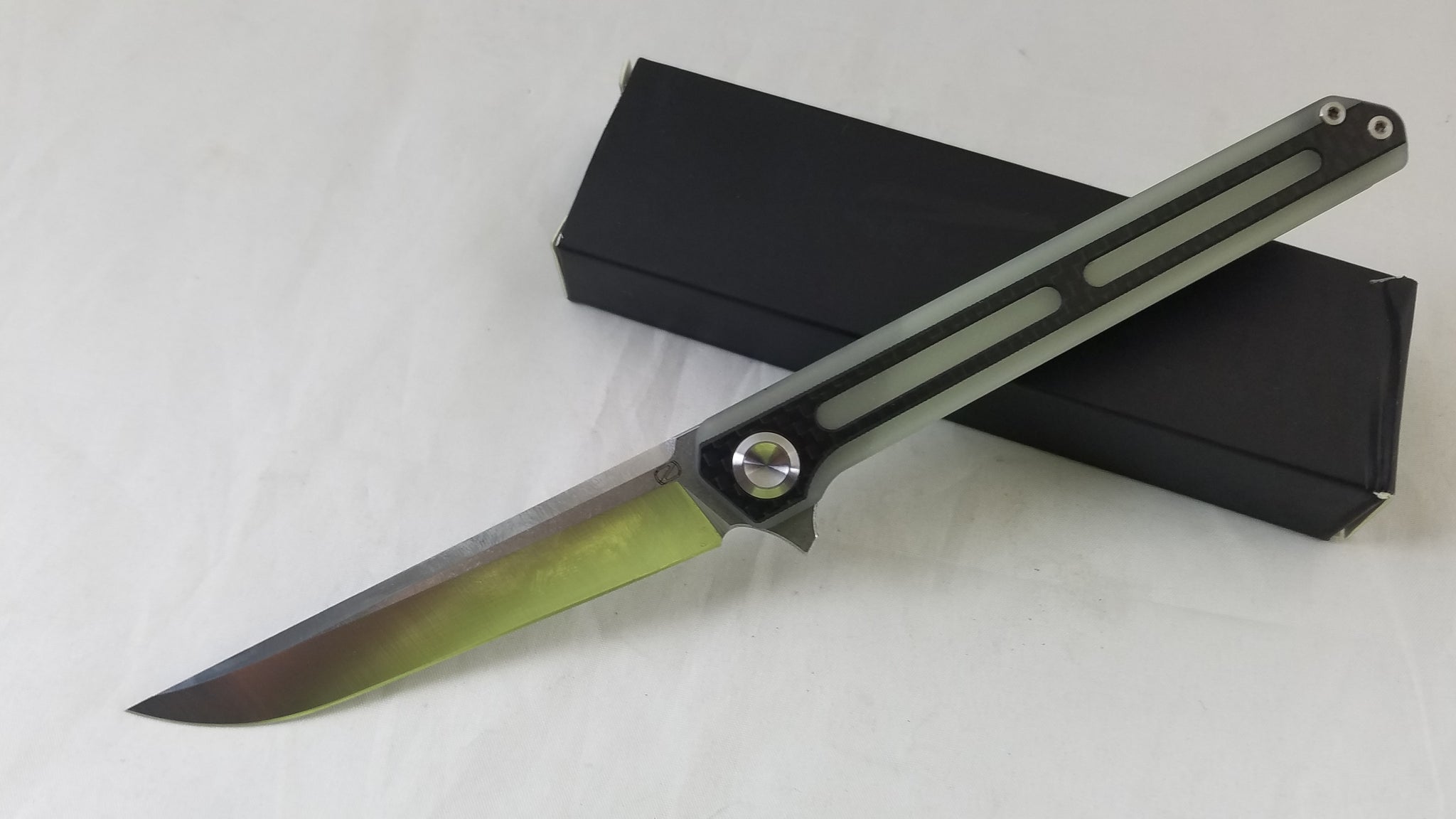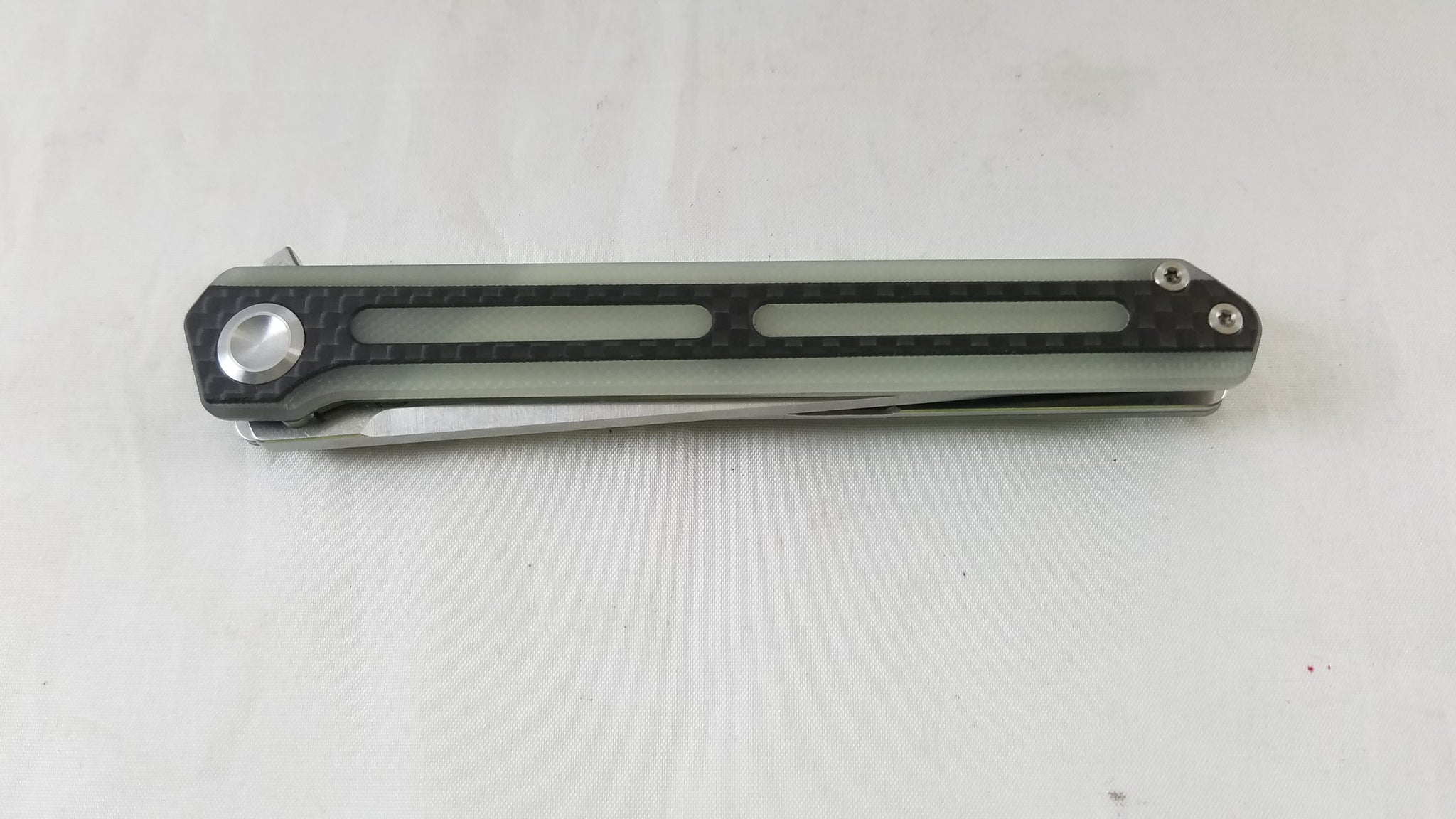4.75" closed. 3.75" satin finish 440C stainless blade. Jade G10 and carbon fiber handle. Flipper. Extended tang. Pocket clip. Boxed. Made in China.