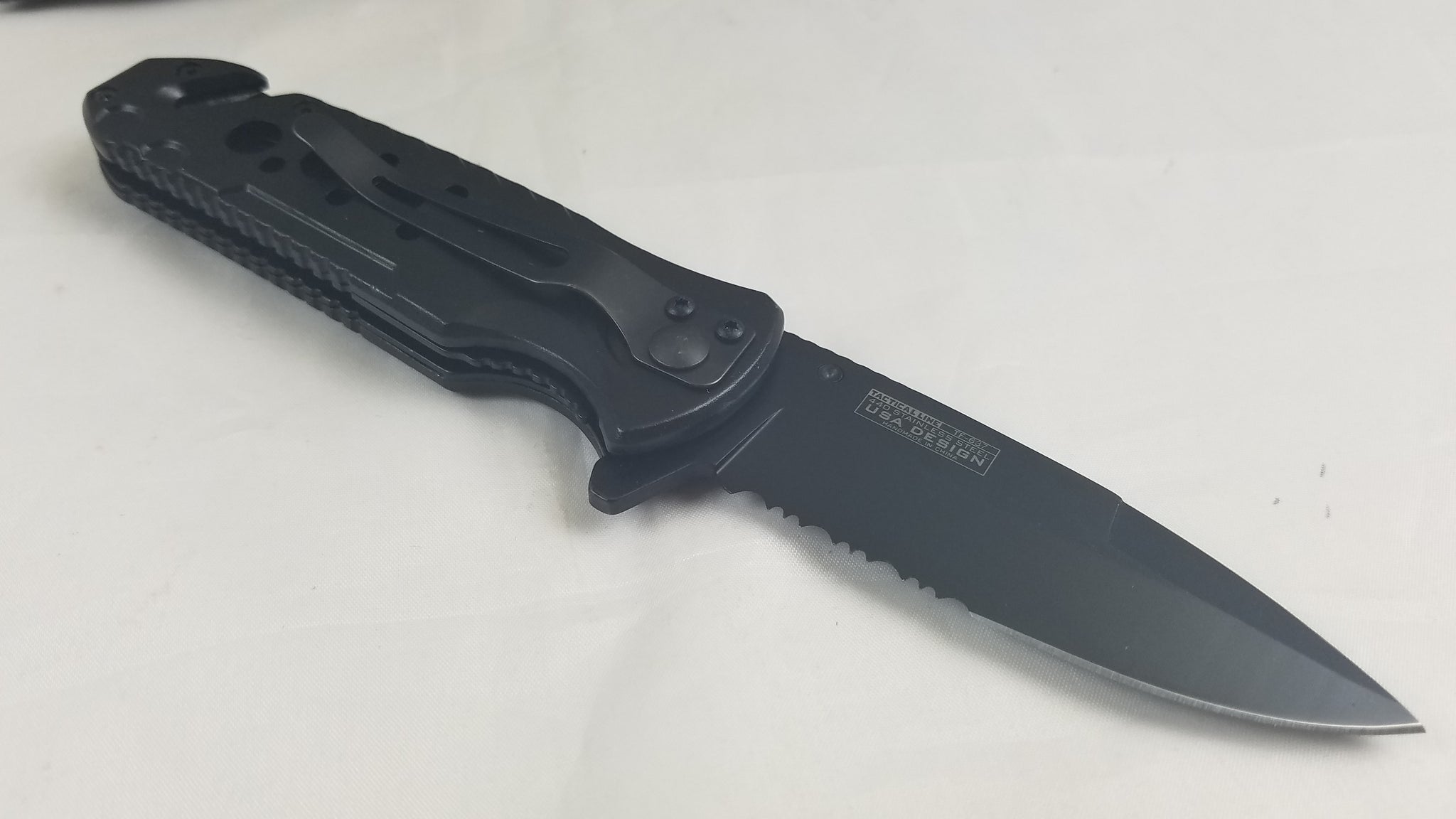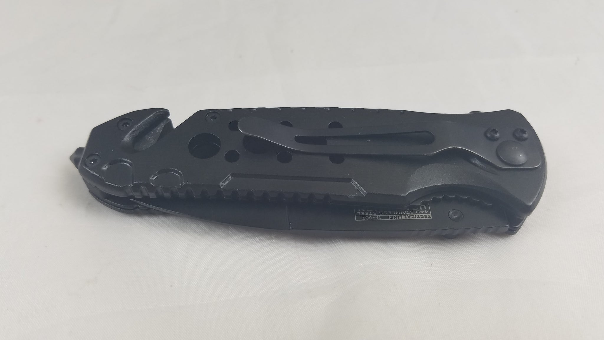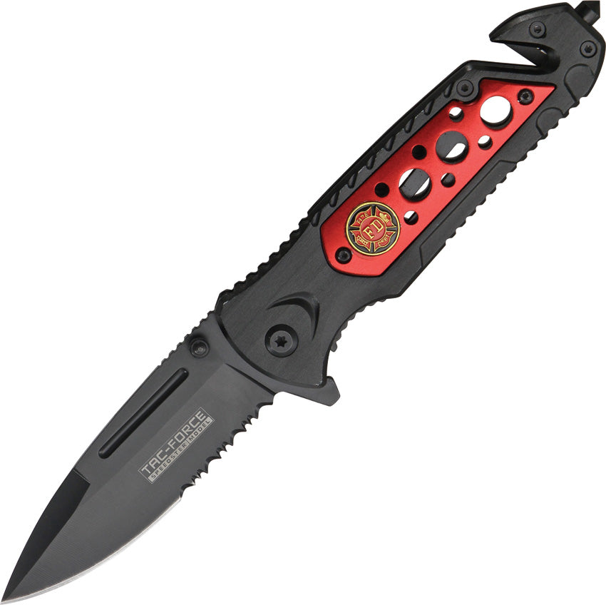 Tac Force Rescue A/O Fire Fighter Speedster. 4 3/4" closed linerlock. Partially serrated assisted opening stainless blade with black finish and thumb stud. Black coated aluminum handles with red inlay trim. Firefighter shield. Seat belt cutter. Glass breaker. Black coated pocket clip.
