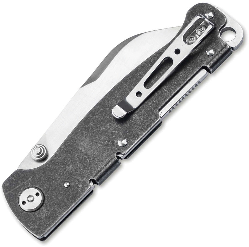 3.75" (9.53cm) closed. 2.88" (7.32cm) satin finish D2 tool steel sheepsfoot blade. Black stonewash finish stainless handle. Thumb stud. Lanyard hole. Pocket clip. Boxed.