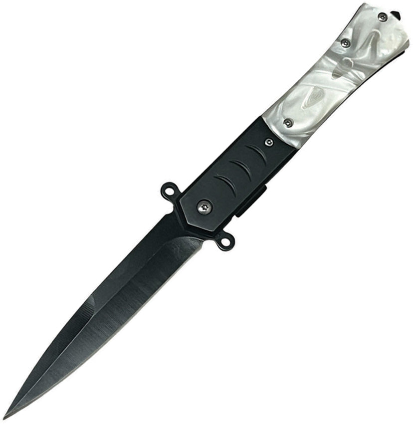 Assisted opening. 5.25" (13.34cm) closed. 4" (10.16cm) black titanium coated false edge 420C stainless blade. White acrylic handle. Stainless bolster(s). Extended tang. Pocket clip. Glass breaker. Boxed.