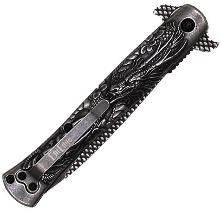 Assisted opening. 5" (12.7cm) closed. 4" (10.16cm) black stonewash finish stainless spear point blade. Black stonewash finish stainless handle. Extended tang. Pocket clip. Dragon handle artwork. Boxed.