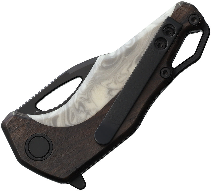 3.25" (8.26cm) closed. 1.75" (4.45cm) black coated 14C28N Sandvik stainless drop point blade. Brown wood handle. Extended tang. Lanyard hole. Pocket clip. Black and white marble resin inlay. Boxed.