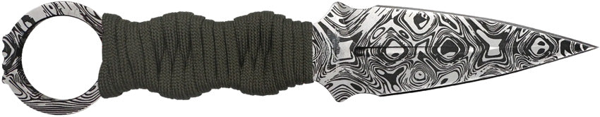 9" (22.86cm) overall. 4.13" (10.49cm) double edge 3Cr13 stainless dagger blade. Green cord wrapped handle. Full, extended tang. Finger ring. Acid etched Damascus pattern blade. Black nylon MOLLE compatible belt sheath. Clam packed.