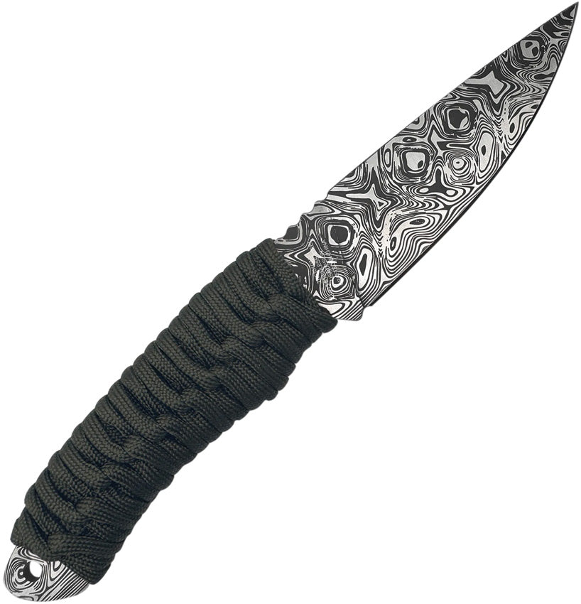 9" (22.86cm) overall. 4.25" (10.8cm) 3Cr13 stainless drop point blade. Green cord wrapped handle. Full, extended tang. Lanyard hole. Acid etched Damascus pattern blade. Black nylon MOLLE compatible belt sheath. Clam packed.