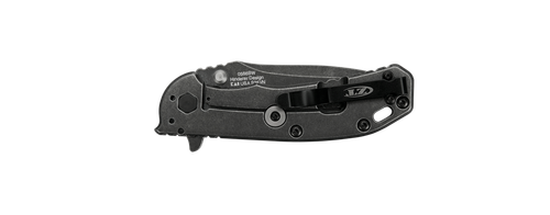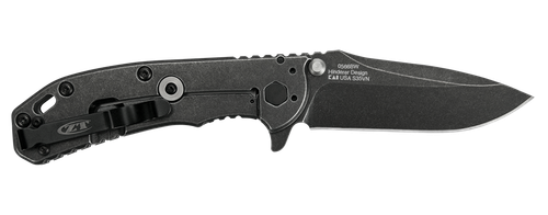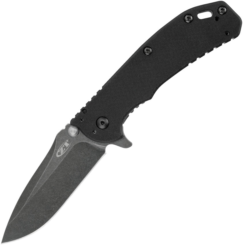 Zero Tolerance Hinderer - 4 1/2" closed framelock. 3 1/4" Blackwash finish Carbon steel drop point blade with dual thumb studs, thumb ridge and extended tang. Lockbar stabilizer. Speed-Safe assisted opening system. Black textured G-10 front handle and Blackwash stainless back handle. Lanyard slot. Quad-mounting system. Deep carry black stainless pocket clip. Serial numbered. Designed by Rick Hinderer. Made in USA.