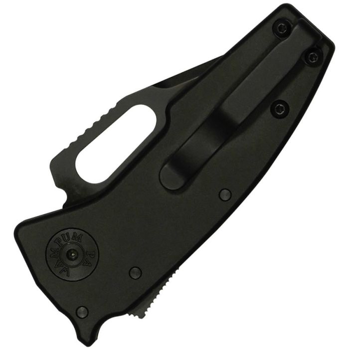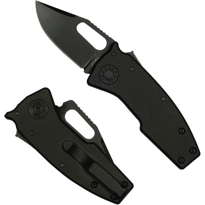 3.75'' closed. 2.125'' Black DLC coated finish CPM-20CV steel clip point blade. Flat Grind. Black aluminum handle. Shark-Lock. Thumb slot. Tip-Up reversible pocket clip. Designed by Andrew Demko. Boxed.