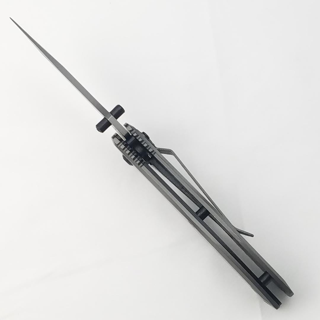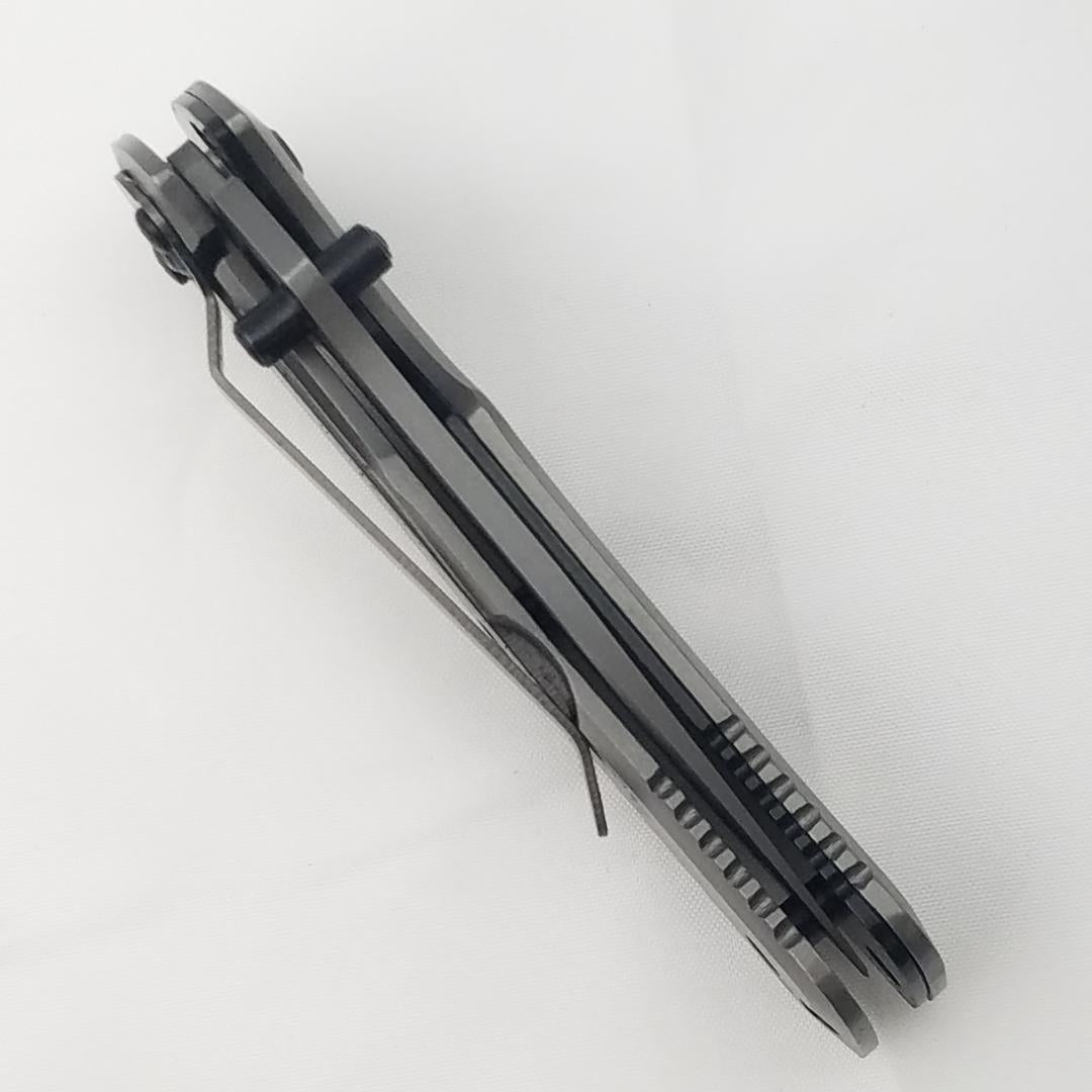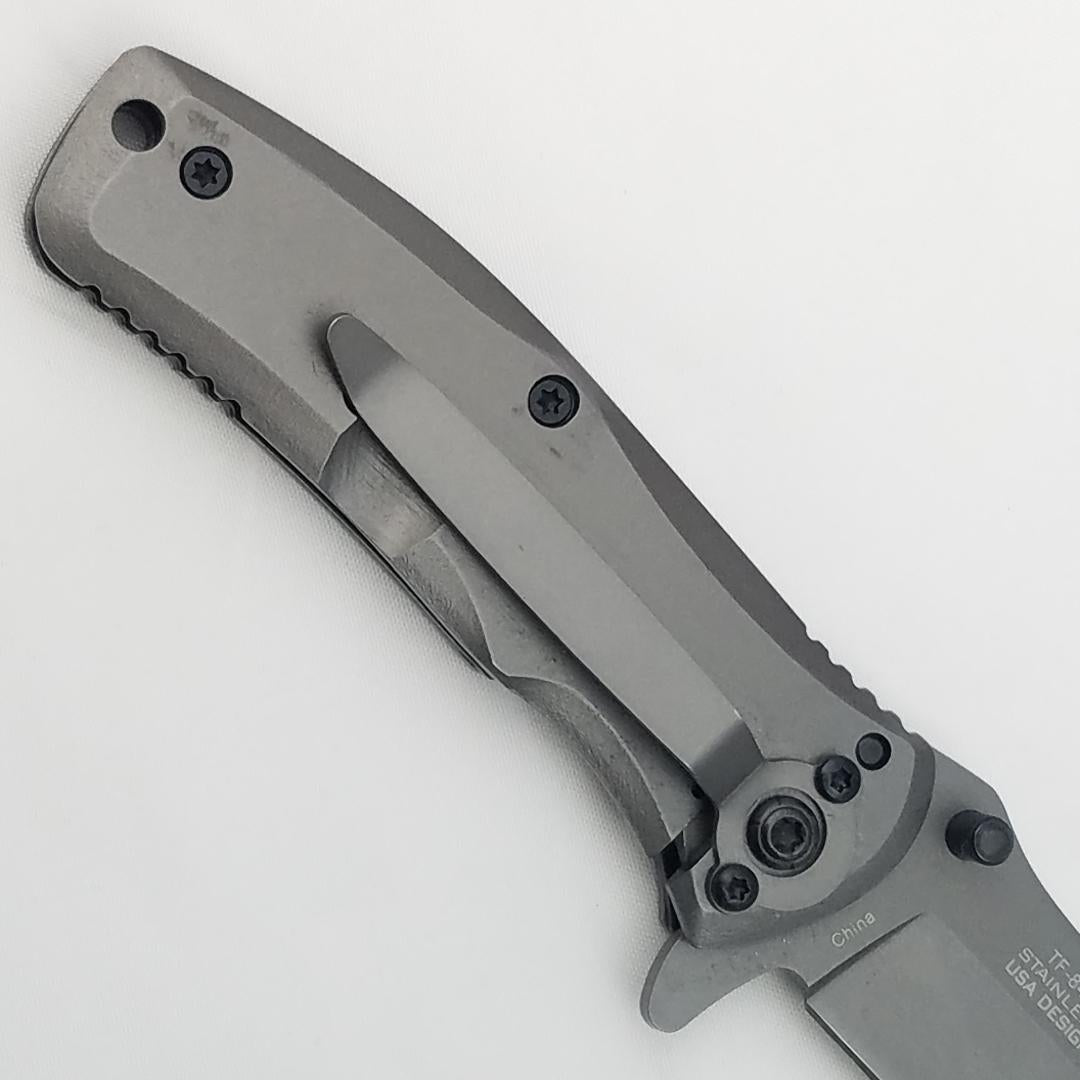 3 1/2" closed. 2 3/4" gray titanium coated 440C stainless assisted opening drop point blade with dual thumb studs and extended tang. Gray titanium coated stainless handles with lanyard hole. Stainless pocket clip.